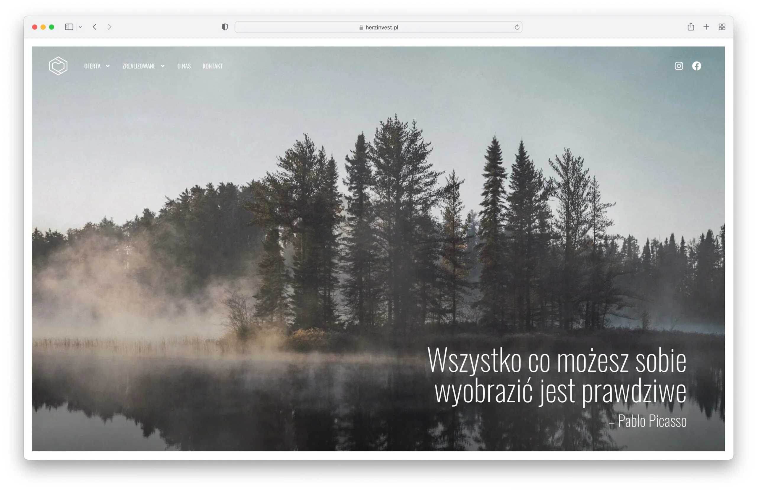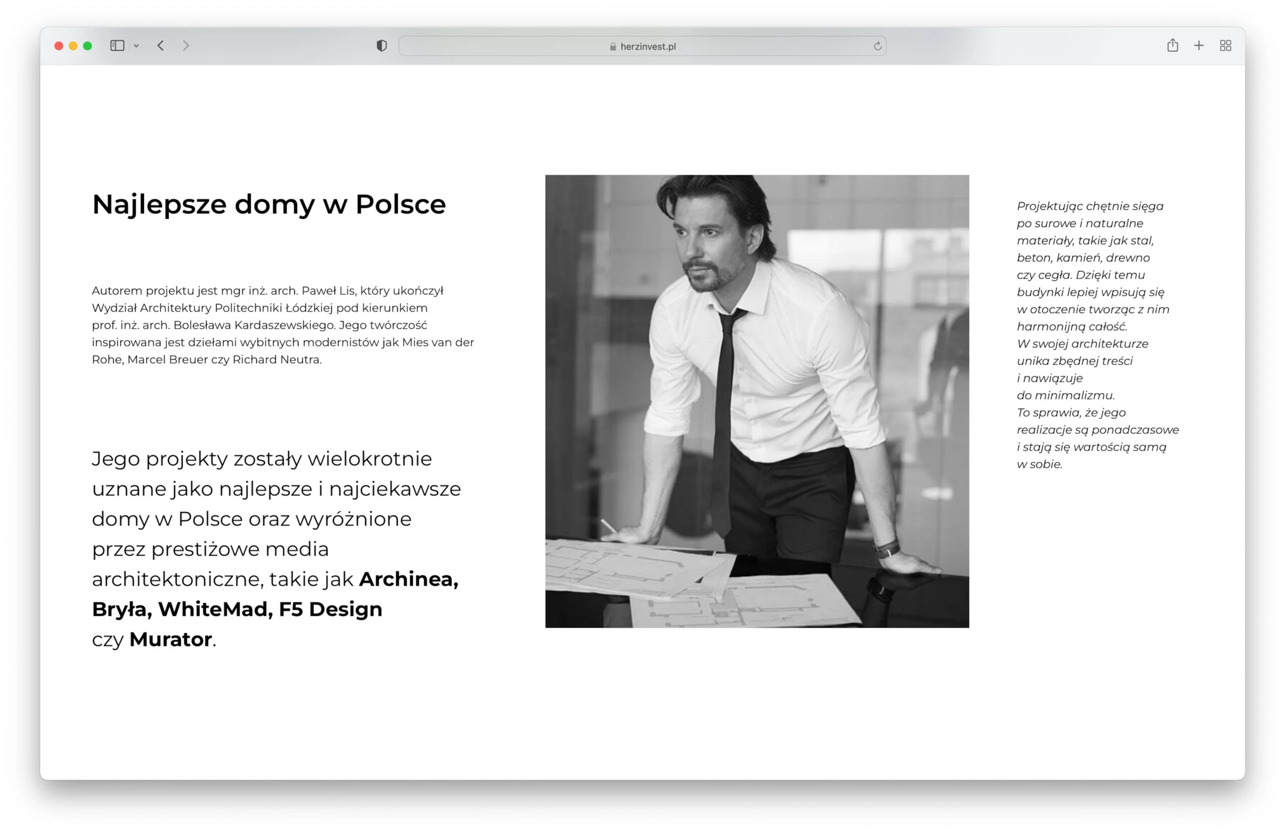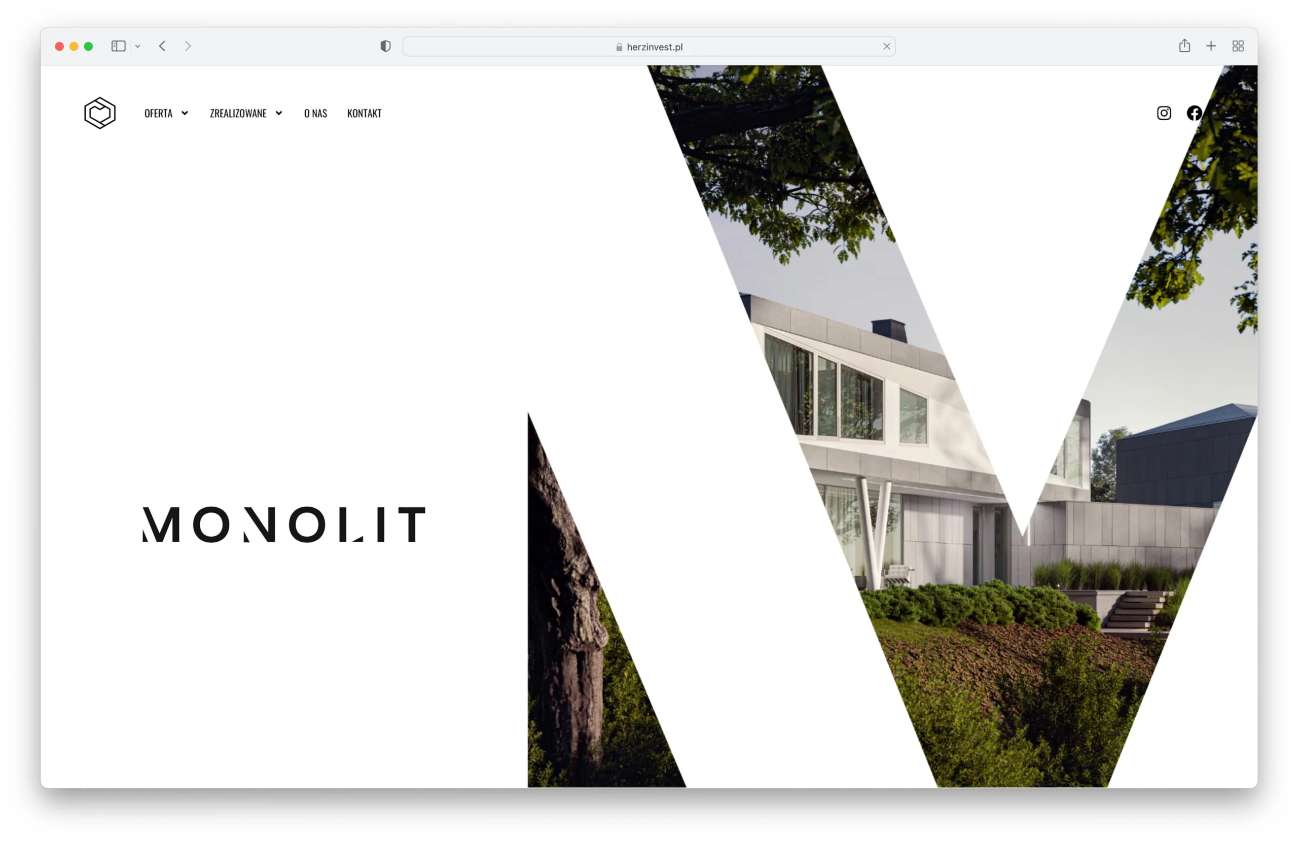 Stonowany, przemyślany projekt podkreśla wyjątkowy charakter inwestycji i pozwala w pełni zanurzyć się w pięknie architektury. Delikatne zabiegi graficzne, takie jak animowana mgła na stronie głównej, czy subtelne animacje elementów strony współgrają z ekskluzywnością projektu domów.